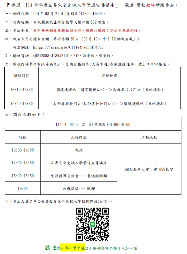 五、參加人員名單公告於五專完全免試入學諮詢群組(請參閱附件)。