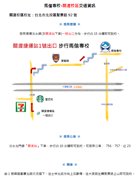 七、因校內停車位有限停滿為止,另備有接駁車(大南客運)在關渡捷運站一號出口來回接送,發車時段請參閱附件,請多加利用大眾交通運輸工具,造成不便敬請見諒。