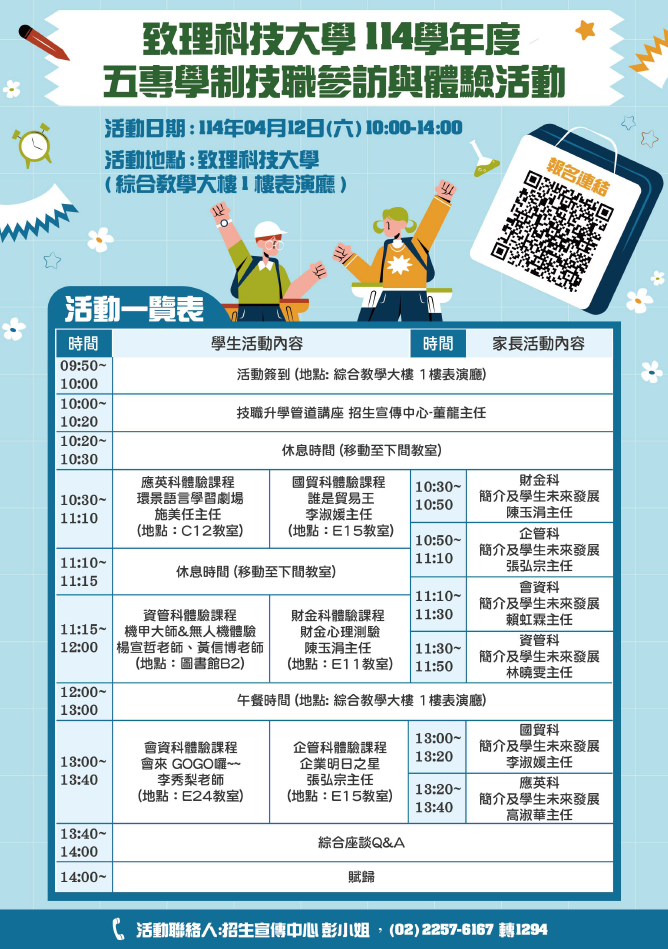 一、為使九年級學生及家長更充分了解技職教育,特辦理「114學年度五專學制技職參訪與體驗活動」。