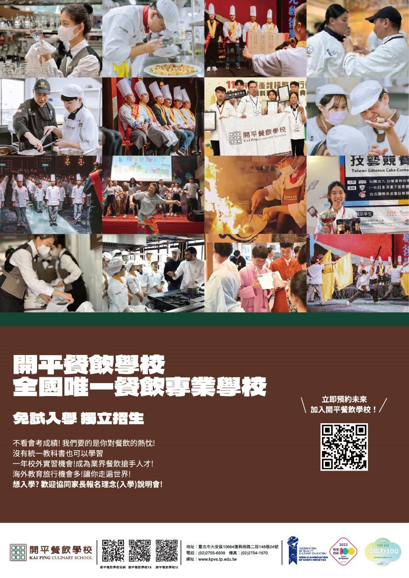 一、為使更多國中學生對技職教育深入瞭解,本校辦理「實體理念說明會」及「線上理念說明會」,提供學生、家長認識本校教育理念與餐飲教學特色,協助增進國中學生及其家長對職業類科升學管道及學習內容之試探,期望開平優秀學子成為臺灣及國際餐飲界之人才。