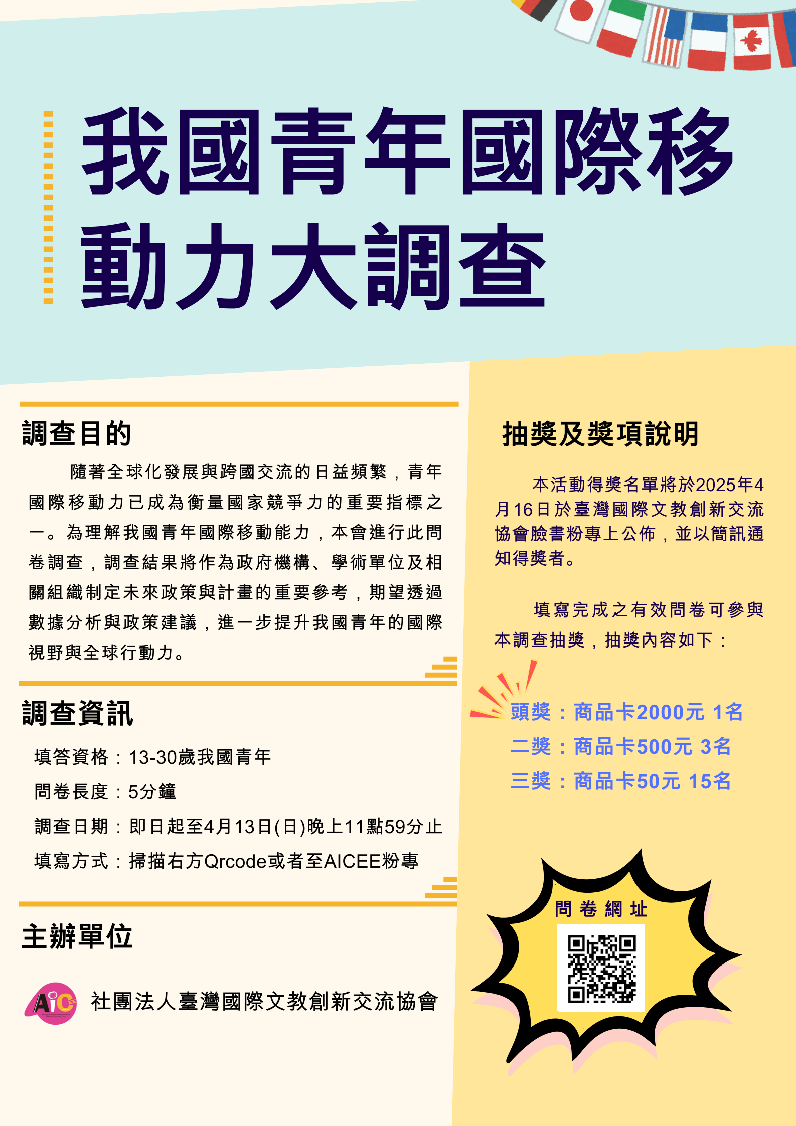 五、為鼓勵青年踴躍填寫,本會提供豐富抽獎機會,獎項包含1