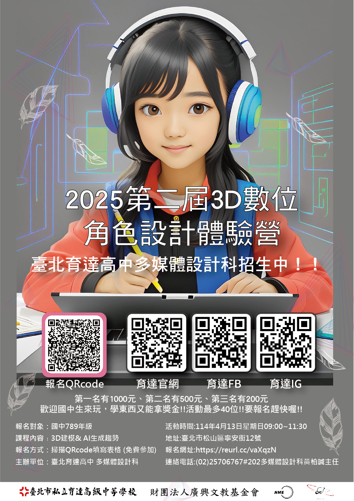 一、育達高中以掌握趨勢,培育達人作為宗旨,希望能夠讓更多學生及早學習職場技能,在業界成為佼佼者。「3D數位遊戲藝術」為勞動部全國技能競賽職種,本校4年來協助培訓3D職種榮獲多項佳績,本次活動找來3D動畫師,歡迎國中生來體驗!!