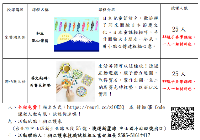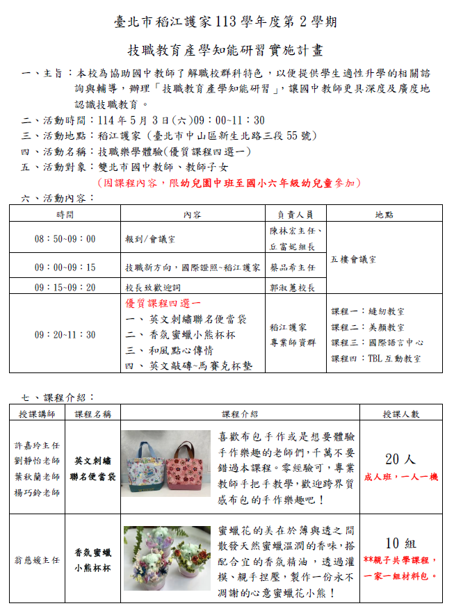 二、本學期於114年5月3日(六)上午09:00-11:30,辦理「技職樂學體驗~英文刺繡聯名便當袋、香氛蜜蠟小熊杯杯、 和風點心傳情、英文敲磚~馬賽克杯墊」優質課程四選一,讓雙北市教師擁有技職體驗學習課程。誠摯邀請 貴校教師及輔導學生升學相關行政人員踴躍報名參加,全程免費。