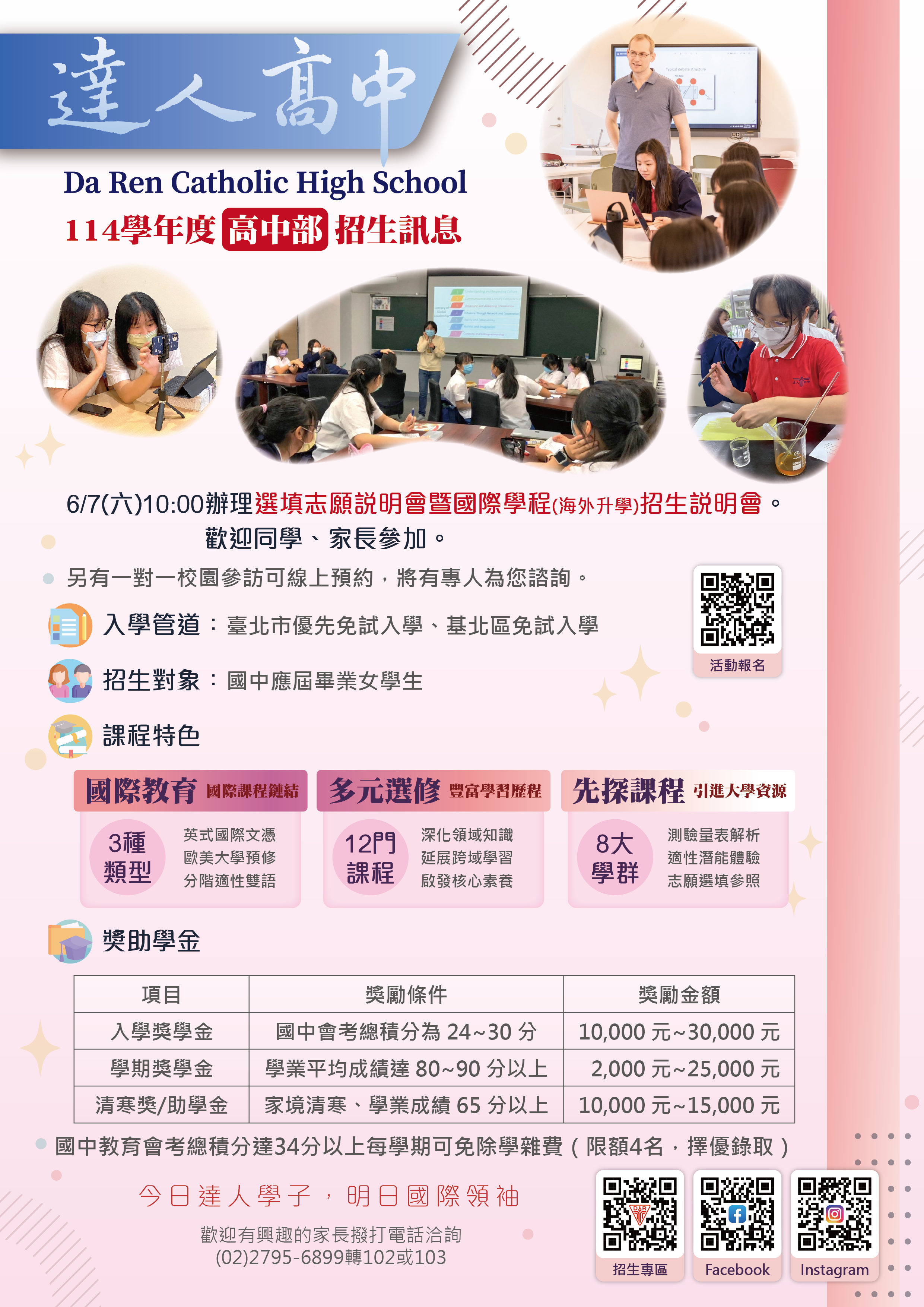 本校入學管道為臺北市第二類優先免試入學、基北區免試 入學,相關訊息及說明均載於本校網站及本校高中部招生 專區,網址連結:https://sites.google.com/trgsh.tp. edu.tw/2023drsh/。本校訂於6月7日(星期六)上午10時辦理志願選填說明會 暨國際學程(海外升學)招生說明會,歡迎九年級女學生及 家長踴躍報名參加,活動報名連結:https://reurl.cc /vQLzll。