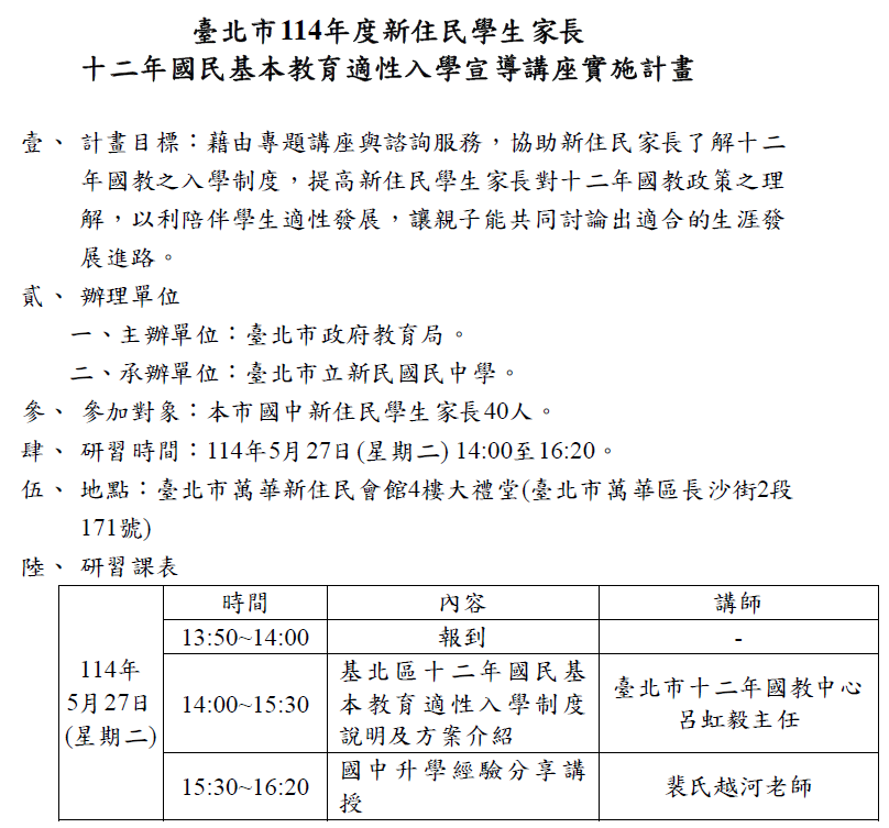 一、為協助新住民家長了解十二年國教之入學制度,提高新住民家長對十二年國教政策之理解,以利陪伴學生適性發展,讓親子能共同討論出適合的生涯發展進路,爰辦理旨