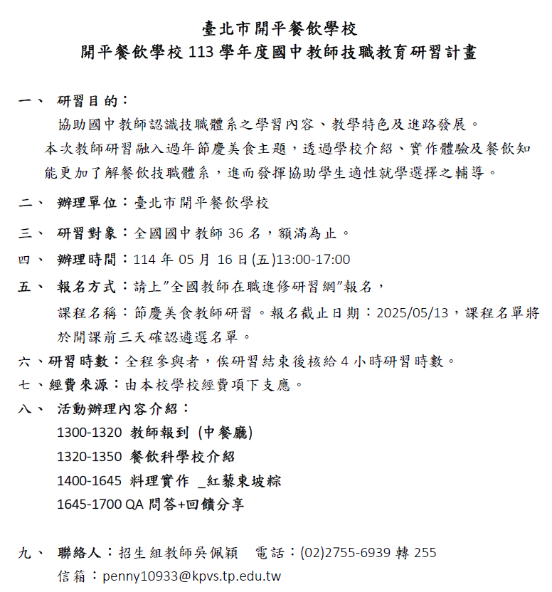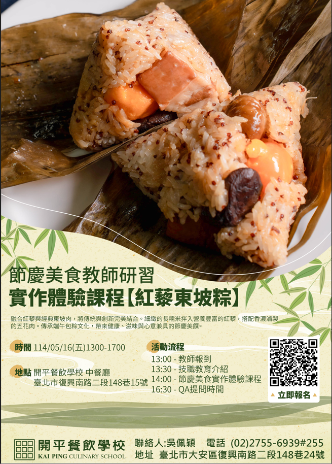 四、報名方式:採線上報名,請上”全國教師在職進修資訊網”報名,課程名稱:節慶美食教師研習,課程代碼:4993113。報名截止日期:114年05月13日(二),課程名單將於開課前三天確認遴選名單。