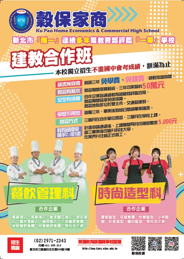 一、本校建教合作班為新北市唯一連續八年評鑑一等的優質學校,招生科別:輪調式時尚造型科及輪調式餐飲管理科。
