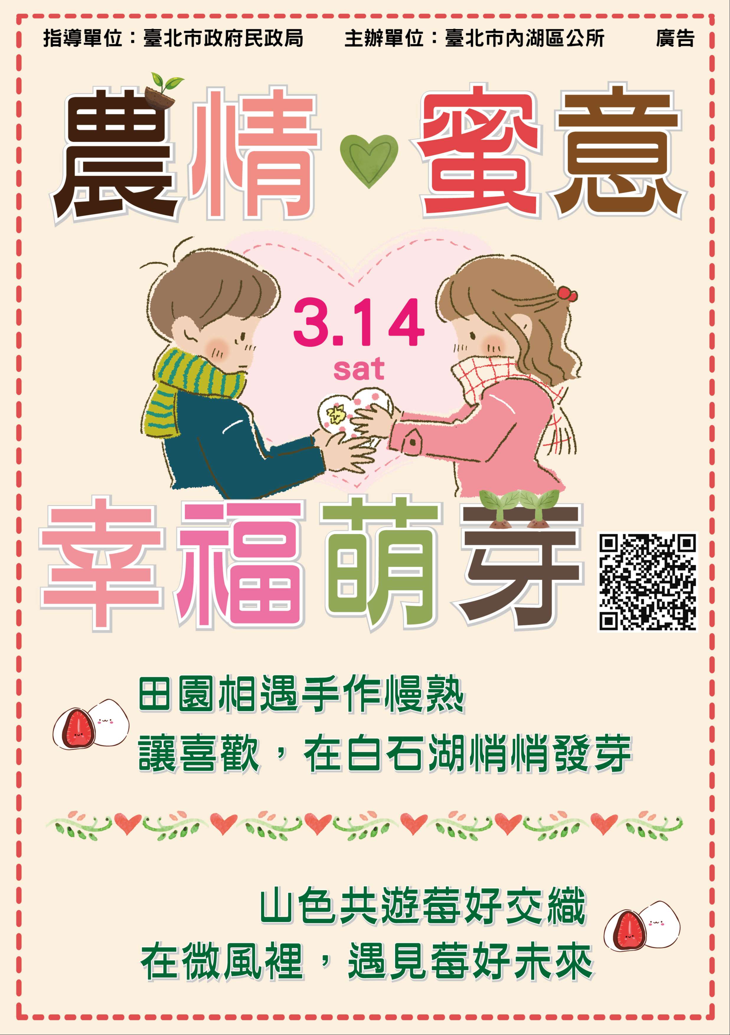 二、本市內湖區公所推出「農情蜜意・幸福萌芽」單身聯誼活動,結合自然體驗與輕鬆互動,打造零壓力交友環境。名額有限、報名即將截止,臺北市單身男女快把握機會,一起讓幸福萌芽!
