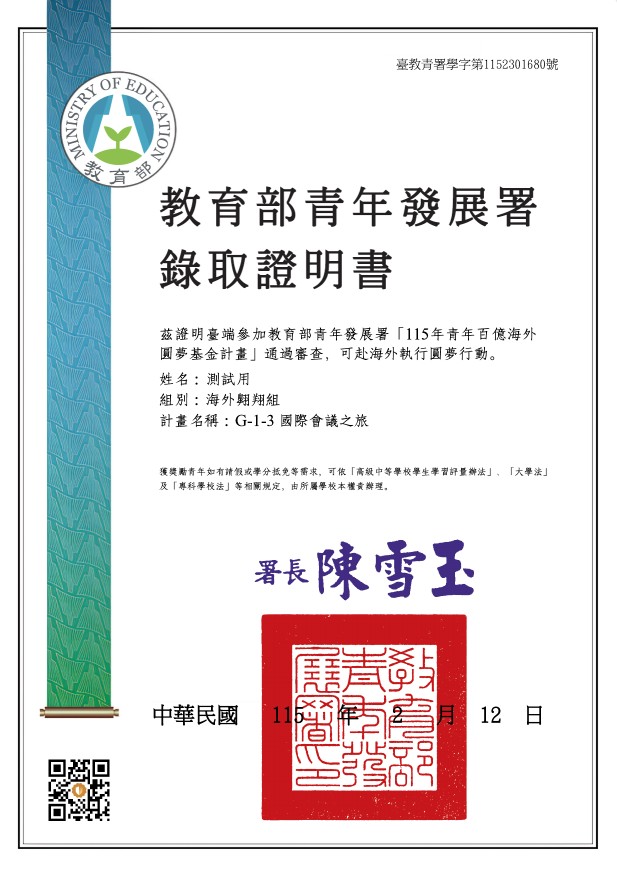 三、本計畫115年第1梯次、第2梯次錄取結果將陸續公告,青年 署將製作並提供錄取青年錄取證明書,供其辦理請假或相 關行政程序使用,為利行政作業,青年可主動持錄取證明 書向其所就學或任教之學校申請公假,青年署將不另行提 供錄取名單予各校。