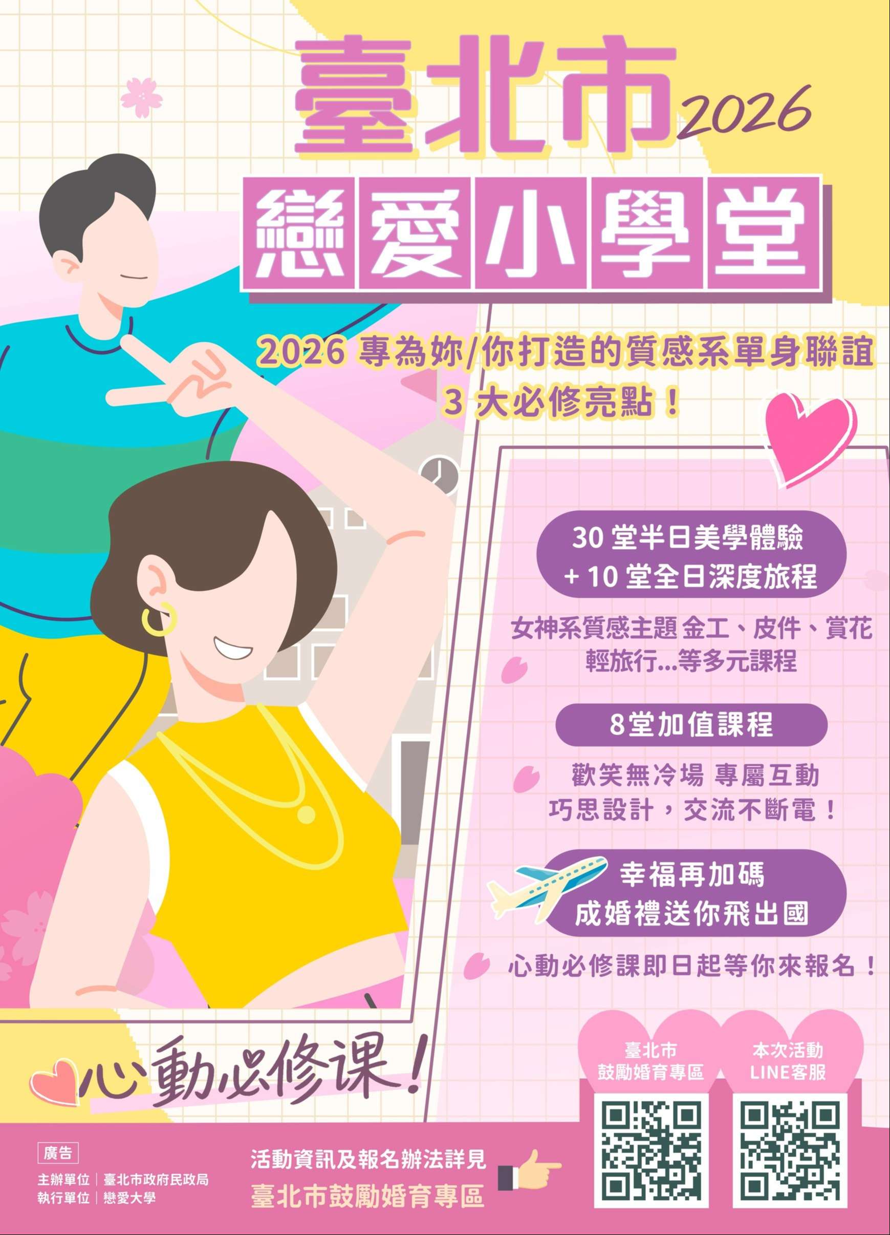 一、臺北市政府民政局單身聯誼【2026臺北市戀愛小學堂-心動必修課!】開放報名囉!6/6至12/5依據女性喜好打造,有金工、花藝、手作香氛蠟燭、聖誕節派對等共40堂活動,凡年滿25歲以上在臺設有戶籍者之單身朋友皆可參加。